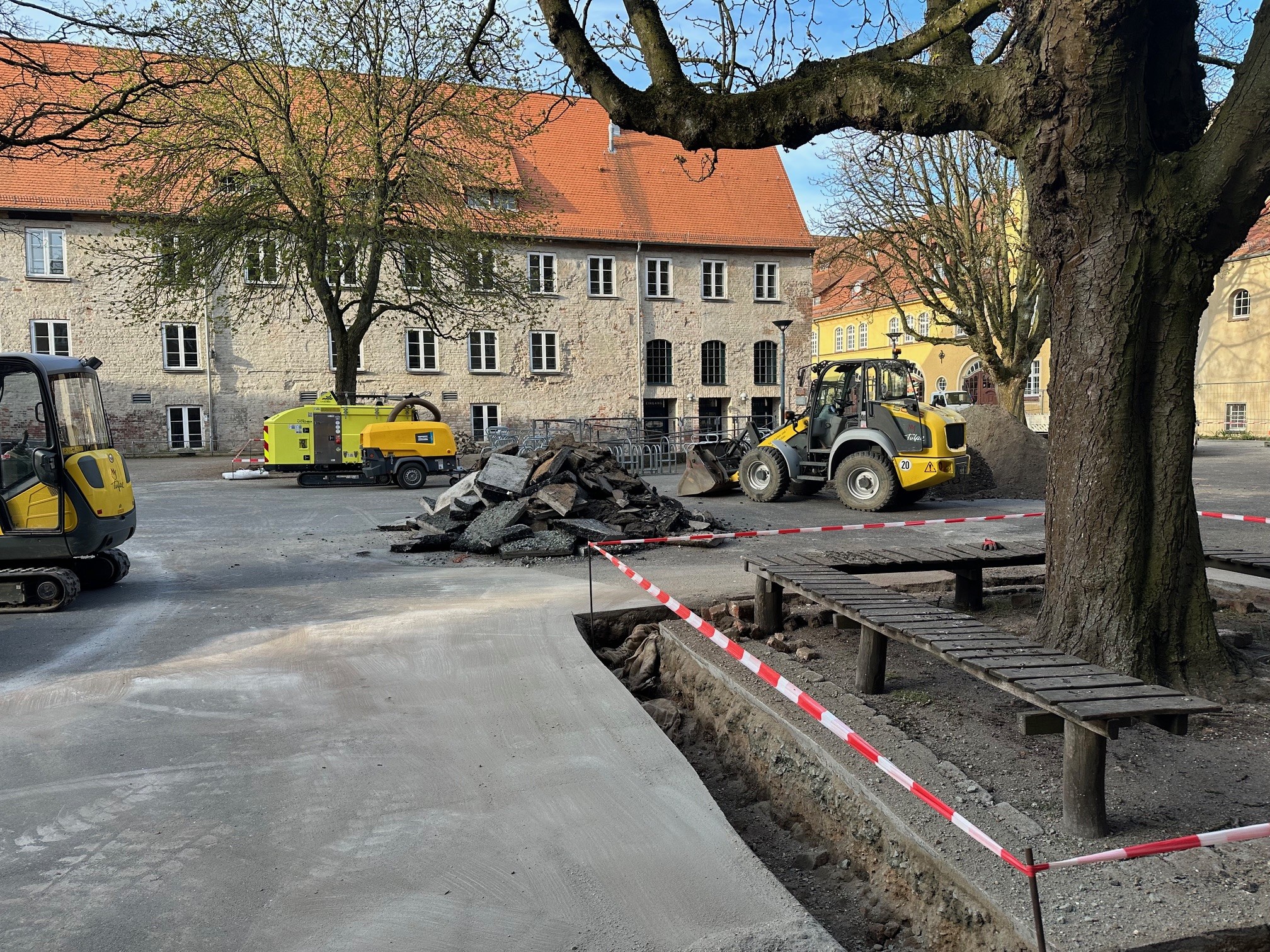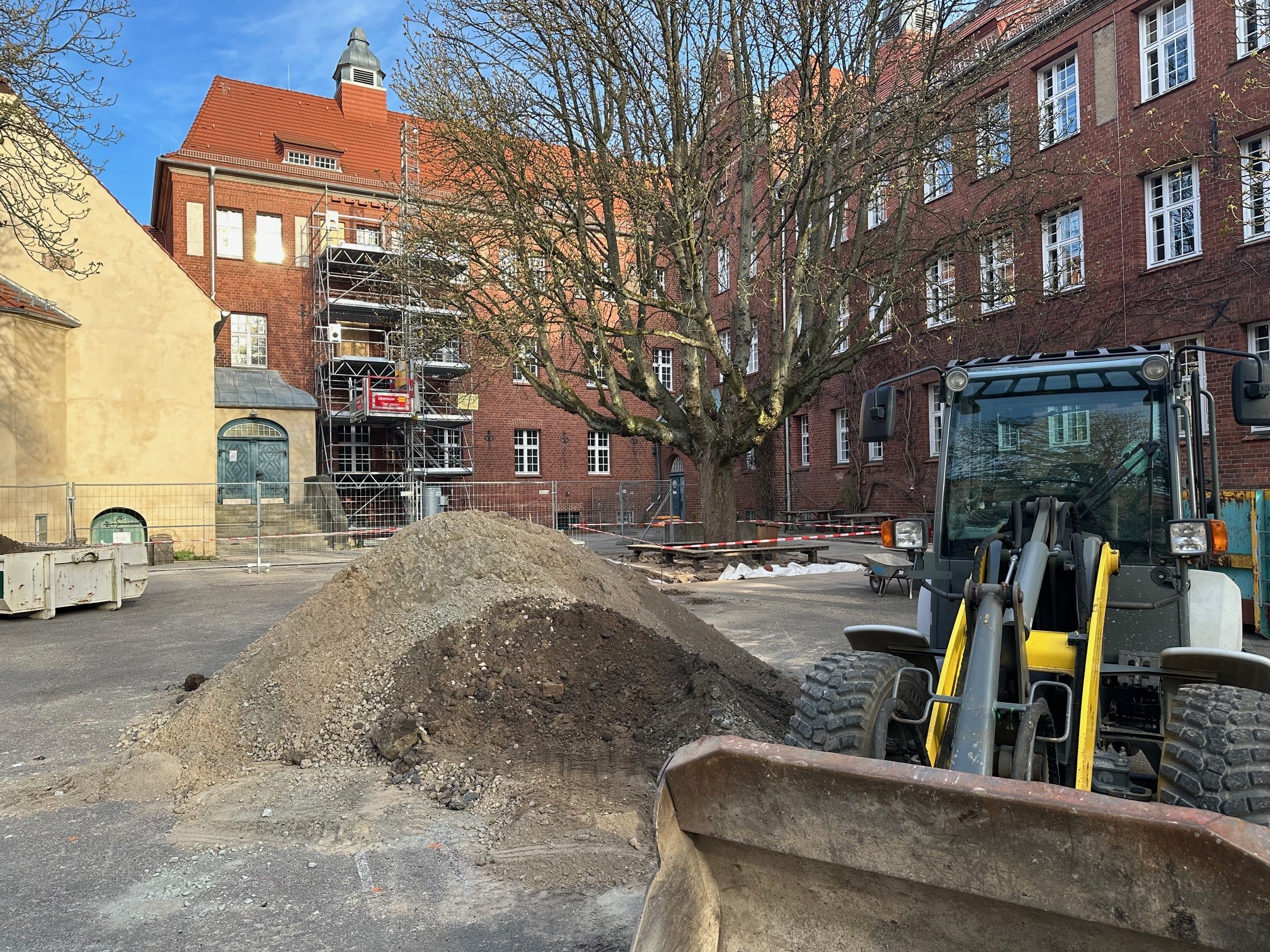 Auf dem Schulhof wurde in den Ferien auch gegraben. Hier wurde untersucht, was man tun muss, damit die Bäume die Neugestaltung des Schulhofes gut überstehen. Außerdem wurde nach dem altem Pflaster gesucht, das es früher gegeben hat. Am Donnerstag vor Ferienende sah es noch nicht so aus, als ob wir den Schulhof würden nutzen können. Interessante Erkenntnis: Die Wurzeln der Kastanien verlaufen dicht unter der Teerdecke, weil sich dort Kondenswasser sammelt. Der Ahorn vor der kleinen Sporthalle hingegen wurzelt viel tiefer.