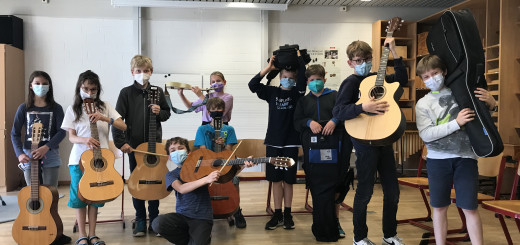 Das Foto lässt es zwar nicht vermuten, aber die GuitarBar der 5. Klassen weiß natürlich, wie man eine Gitarre richtig hält. Für euch hat sie die die amerikanische Melodie „Aura Lee“ aufgenommen.