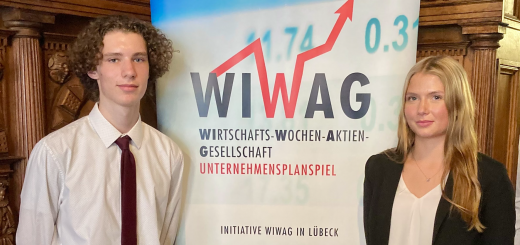 In der Woche vom 22. bis 27. September nahmen eine Schülerin und ein Schüler des Q1-Jahrgangs am Unternehmensplanspiel WIWAG (Wirtschafts-Wochen-Aktien-Gesellschaft) der Kaufmannschaft zu Lübeck teil. Als Vorstände fiktiver Unternehmen – in diesem Fall Produzenten einer Kaffeemaschine – trafen sie Entscheidungen in verschiedenen Bereichen wie Personal, Marketing, Produktion und Finanzen.